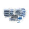 Vials packaged in a clear-lid tray. Caps with septa packaged in a plastic bag.