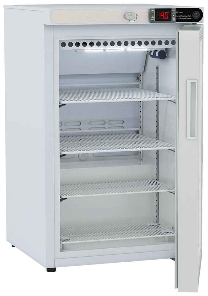 These solid door freestanding refrigerators utilize microprocessor controllers and feature temperature alarms, remote alarm contacts, LED interior lighting, and probe access ports with included probes. American Biotech Supply Vaccine Storage Refrigerators utilize HFC-free refrigerant for environmental health and energy efficiency.