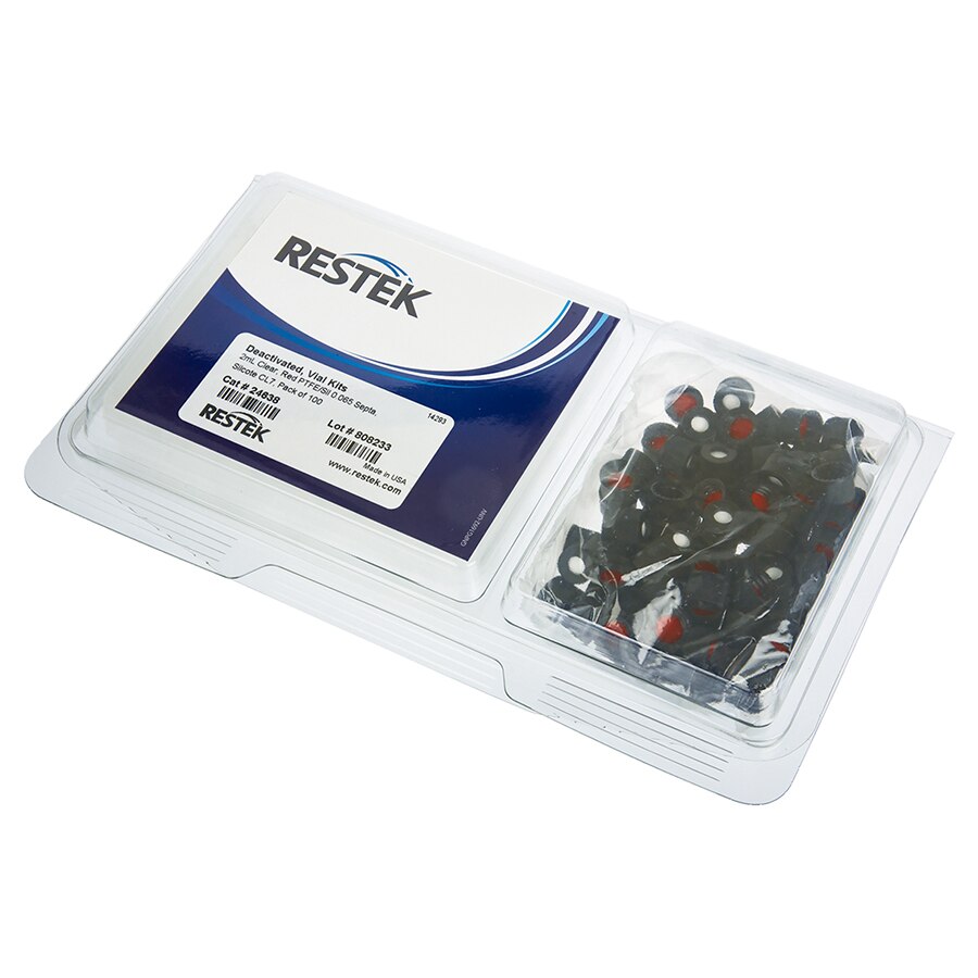 - Black polypropylene open-hole caps and 8 mm red PTFE/silicone septa, 0.065″.