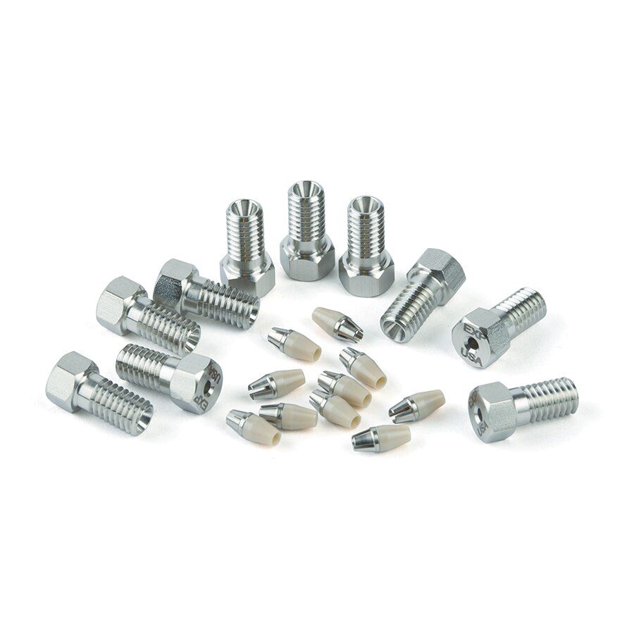 - Hand-tight fitting style achieves effortless HPLC seals—no tools needed for a 8700+ psi seal.