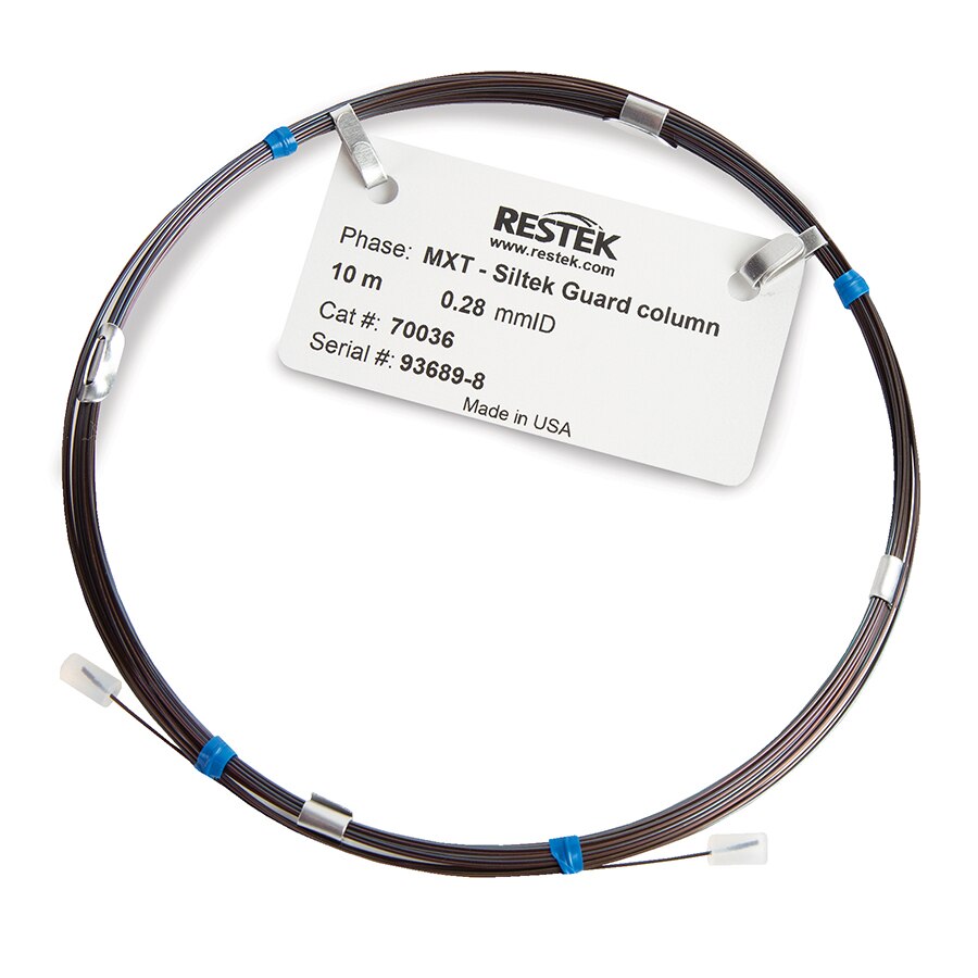 Guard columns and retention gaps are widely used in gas chromatography for different reasons. A guard column traps nonvolatile material at the head of the column, not allowing it to reach the analytical column, protecting it. A retention gap helps focus the compounds transferred from the inlet as a small band at the head of the analytical column to minimize chromatographic peak broadening. Siltek-treated, stainless-steel MXT guard columns provide excellent compatibility with MXT analytical columns while offering the strength of metal with the inertness of glass. These guard columns can also function as retention gaps. To discover how to connect an MXT guard column or retention gap (deactivated tubing) to an analytical column using an MXT low dead-volume connector, see the MXT Low Dead Volume Connectors for Use with Fused Silica Capillary Columns installation instructions.
