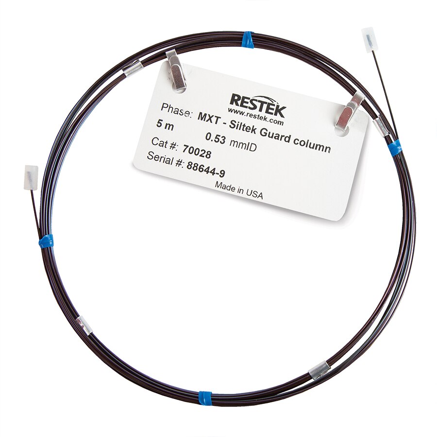 Guard columns and retention gaps are widely used in gas chromatography for different reasons. A guard column traps nonvolatile material at the head of the column, not allowing it to reach the analytical column, protecting it. A retention gap helps focus the compounds transferred from the inlet as a small band at the head of the analytical column to minimize chromatographic peak broadening. Siltek-treated, stainless-steel MXT guard columns provide excellent compatibility with MXT analytical columns while offering the strength of metal with the inertness of glass. These guard columns can also function as retention gaps. To discover how to connect an MXT guard column or retention gap (deactivated tubing) to an analytical column using an MXT low dead-volume connector, see the MXT Low Dead Volume Connectors for Use with Fused Silica Capillary Columns installation instructions.