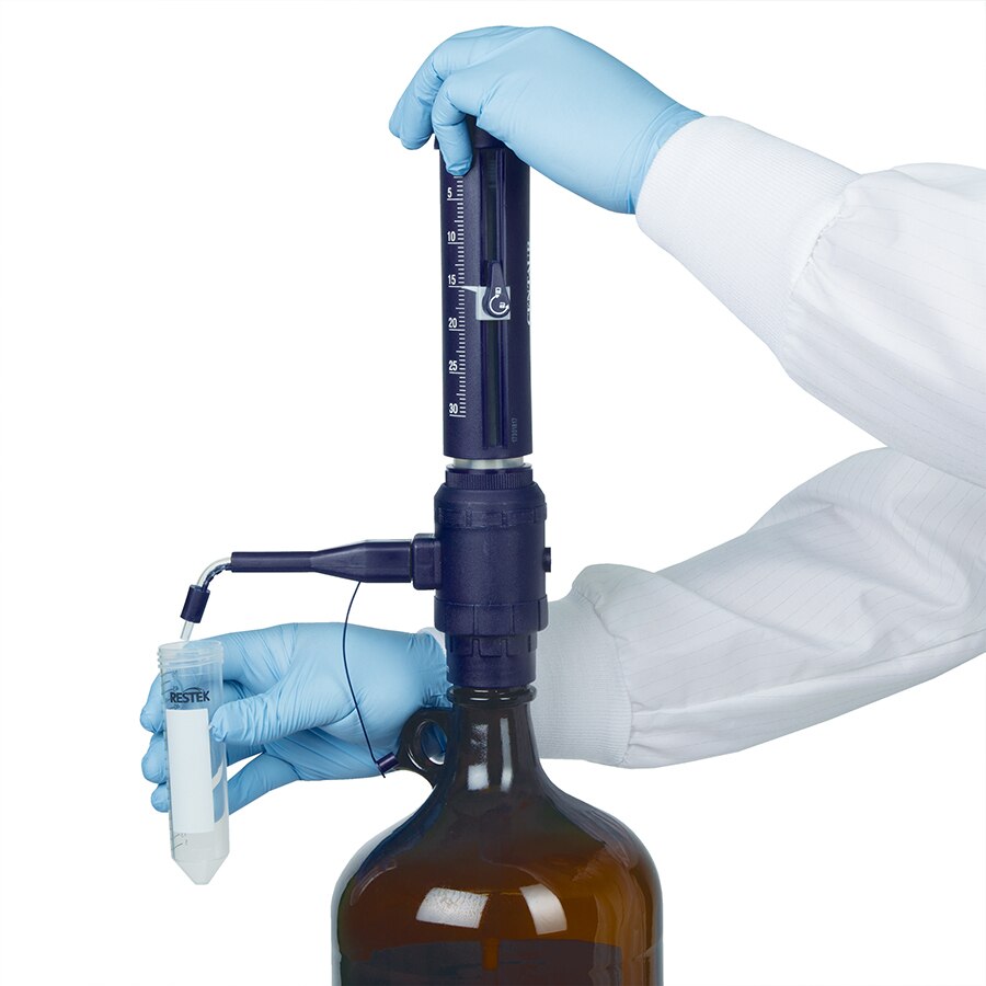 Accurately and precisely dispense liquids for QuEChERS extractions with this versatile pump. A quick, simple adjustment lets you set the output volume anywhere from 2.5 mL to 30 mL per stroke, and the included adaptors will accommodate most reagent bottles.