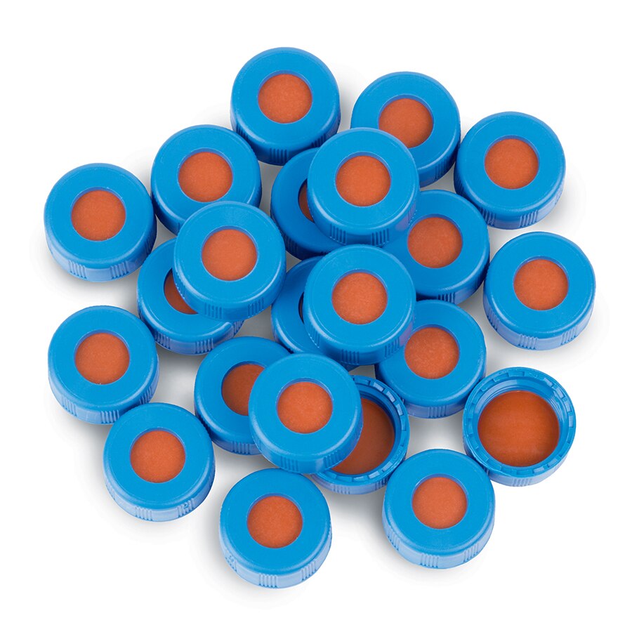 Magnetic Crimp-Top Caps with PTFE/Silicone Septa, 20 mm w/ 8 mm Hole, Gold, Preassembled, 100-pk.
