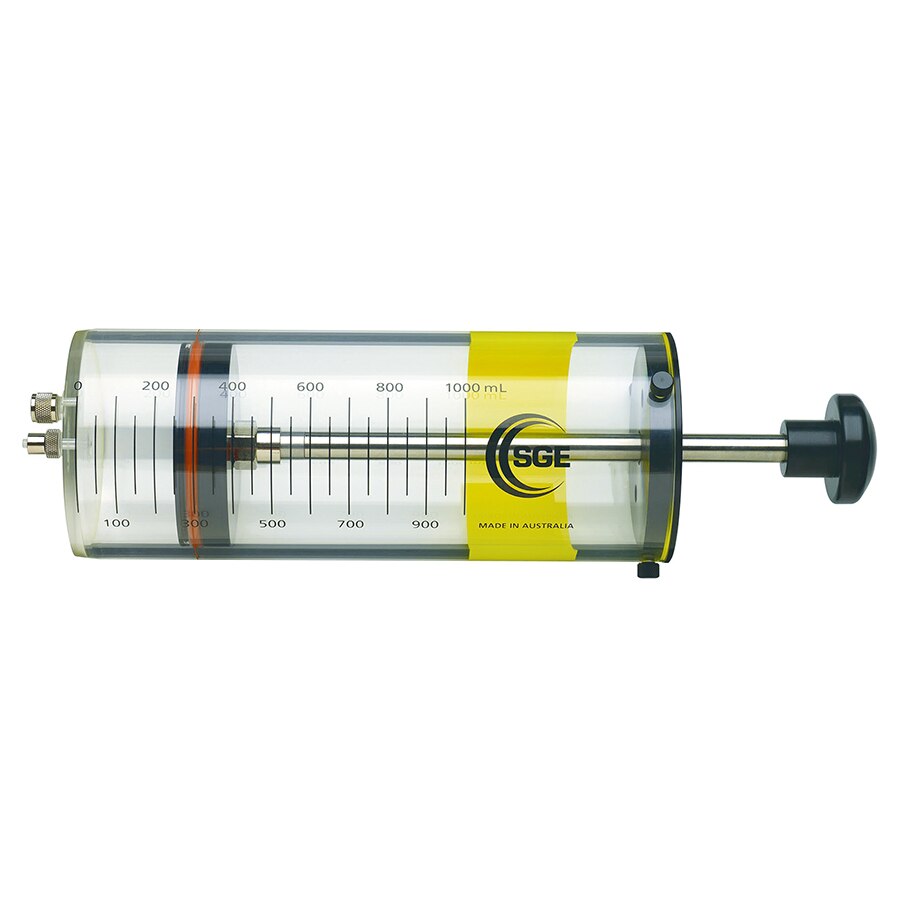 Clear acrylic syringes, ideal for holding and dispensing large volumes of gas. An adjustable plunger on the O-ring ensures that the syringe is gas-tight over a long period of time. The central port is supplied with a luer lock fitting; the secondary port is supplied with a septum nut. This enables access to the gas sample for adding standards or removing a subsample. The plunger stem is detachable, making sample storage easy.