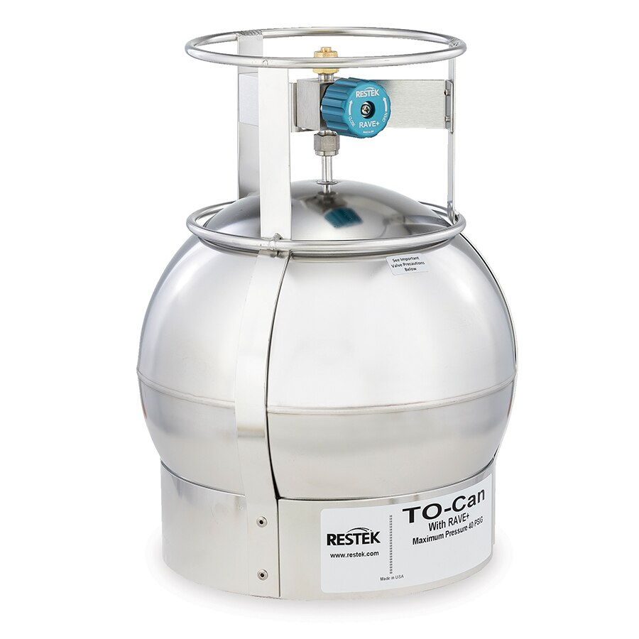 U.S. EPA Methods TO-14A and TO-15A regulate the collection, storage, and analysis of volatile organic compounds (VOCs) using treated air sampling canisters. Restek offers a complete line of TO-Can canisters (SUMMA can equivalent) electropolished using a proprietary process and extensively cleaned using an ultrasonic method. This ensures a high-quality, passivated surface that maintains the stability of TO-14A/TO-15/TO-15A compounds during storage. A frame surrounds the electropolished canister, eliminating the need for weld marks on the sphere, thereby preventing active sites on the canister. The high-performance valve supports the excellent quality of the canister.