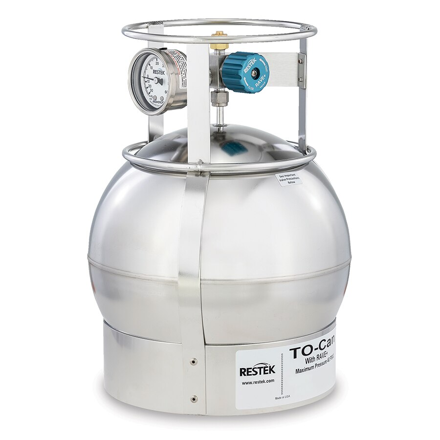 U.S. EPA Methods TO-14A and TO-15A regulate the collection, storage, and analysis of volatile organic compounds (VOCs) using treated air sampling canisters. Restek offers a complete line of TO-Can canisters (SUMMA can equivalent) electropolished using a proprietary process and extensively cleaned using an ultrasonic method. This ensures a high-quality, passivated surface that maintains the stability of TO-14A/TO-15/TO-15A compounds during storage. A frame surrounds the electropolished canister, eliminating the need for weld marks on the sphere, thereby preventing active sites on the canister. The high-performance valve supports the excellent quality of the canister.