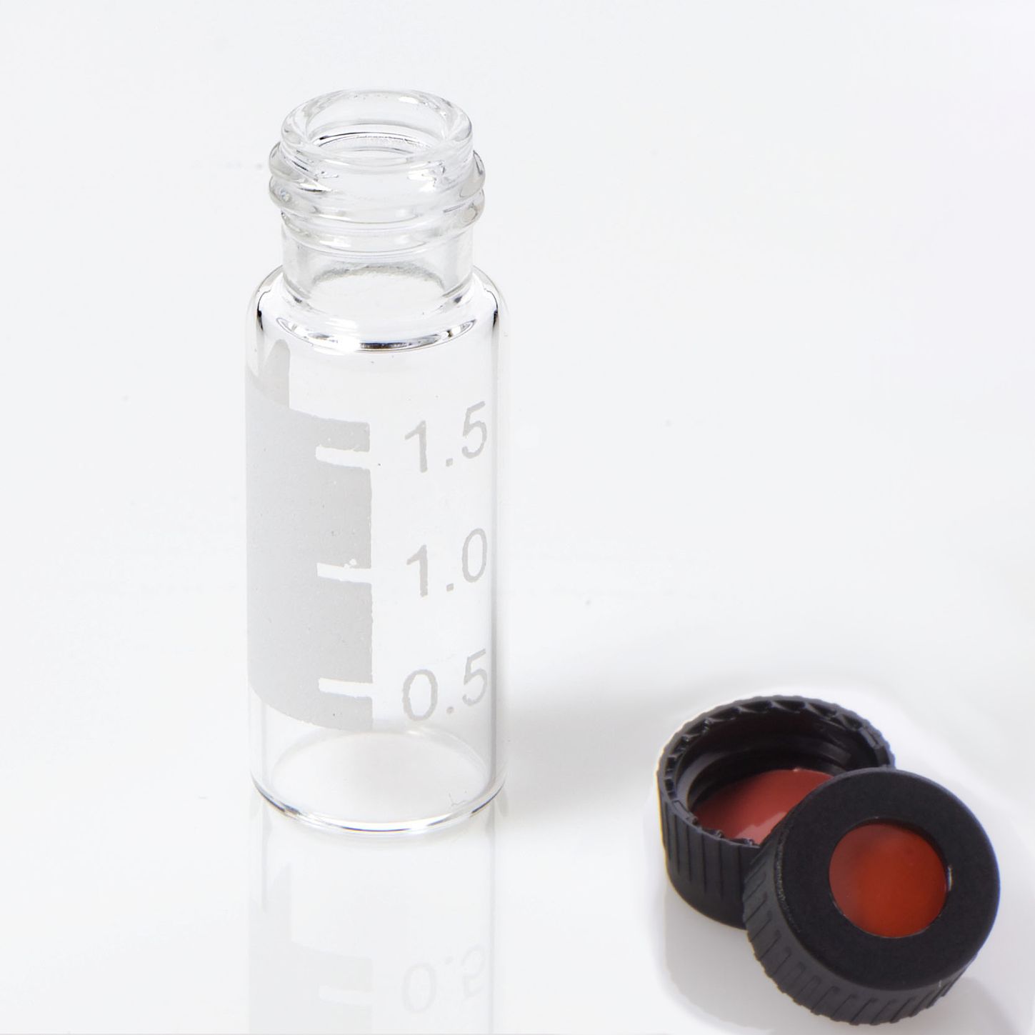 Vial Kit: 2mL Clear Glass Vial with Graduated Marking Spot, 9-425 Black Polypropylene Screw Cap with 0.040″ Bonded PTFE/Red Rubber Septa, 100/pk